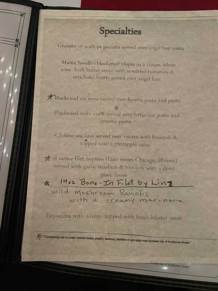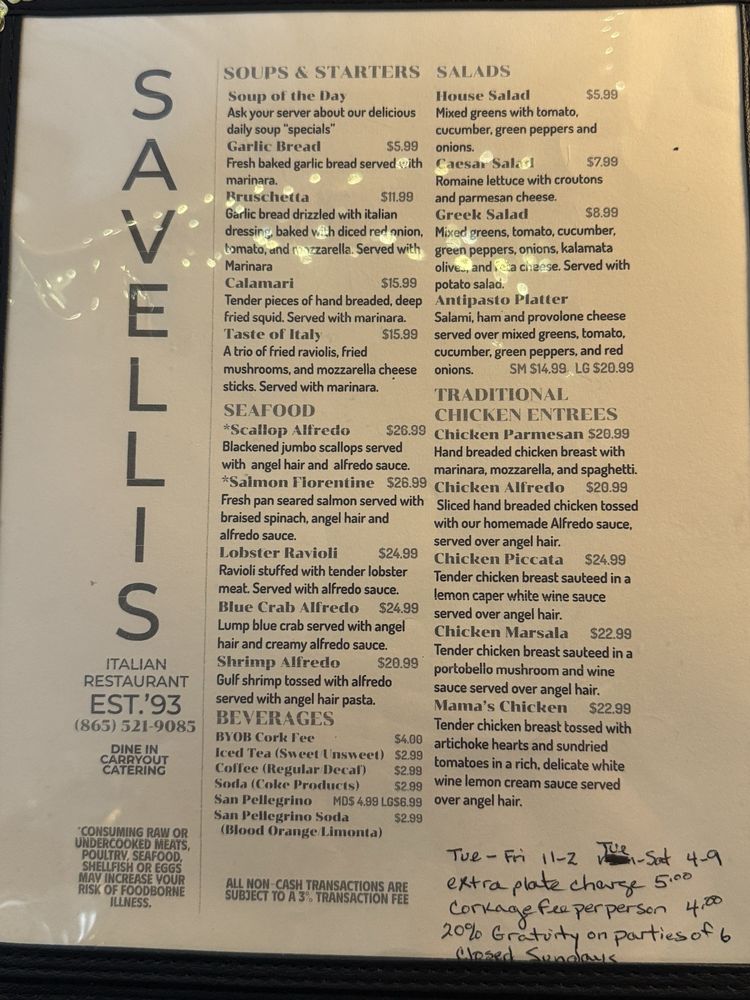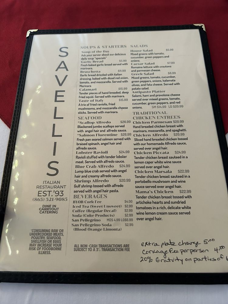 Savelli's Italian, located in Knoxville, TN, offers a cozy, intimate dining experience with a focus on traditional Italian cuisine. The menu includes a variety of vegetarian options and features dishes like New York style pizza with customizable toppings, flavorful seafood alfredo, and delectable desserts such as creme brulee and carrot cake. Customers have shared positive reviews praising the food quality, attentive service, and the option to bring your own wine. The restaurant's BYOB policy adds to the charm of the dining experience, making it a great choice for a romantic evening out or a special celebration. Savelli's Italian provides a unique blend of classic Italian flavors and a welcoming atmosphere, making it a must-visit destination for Italian food enthusiasts in Knoxville.